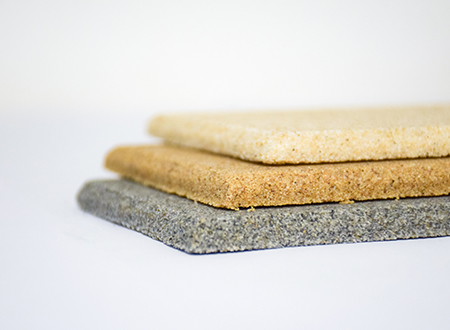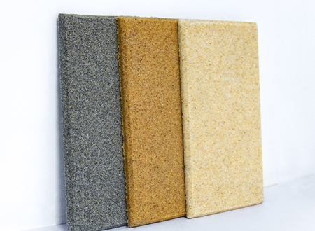 微粒材料是一種新型綠色裝飾材料,具備優(yōu)異的聲學(xué)性和物理性能。該材料是以天然砂?;蚪?jīng)環(huán)保處理的固廢顆粒為骨料,以環(huán)保膠凝劑,通過壓振工藝,生產(chǎn)的具有大量相互連通的微小空隙的多孔材料。